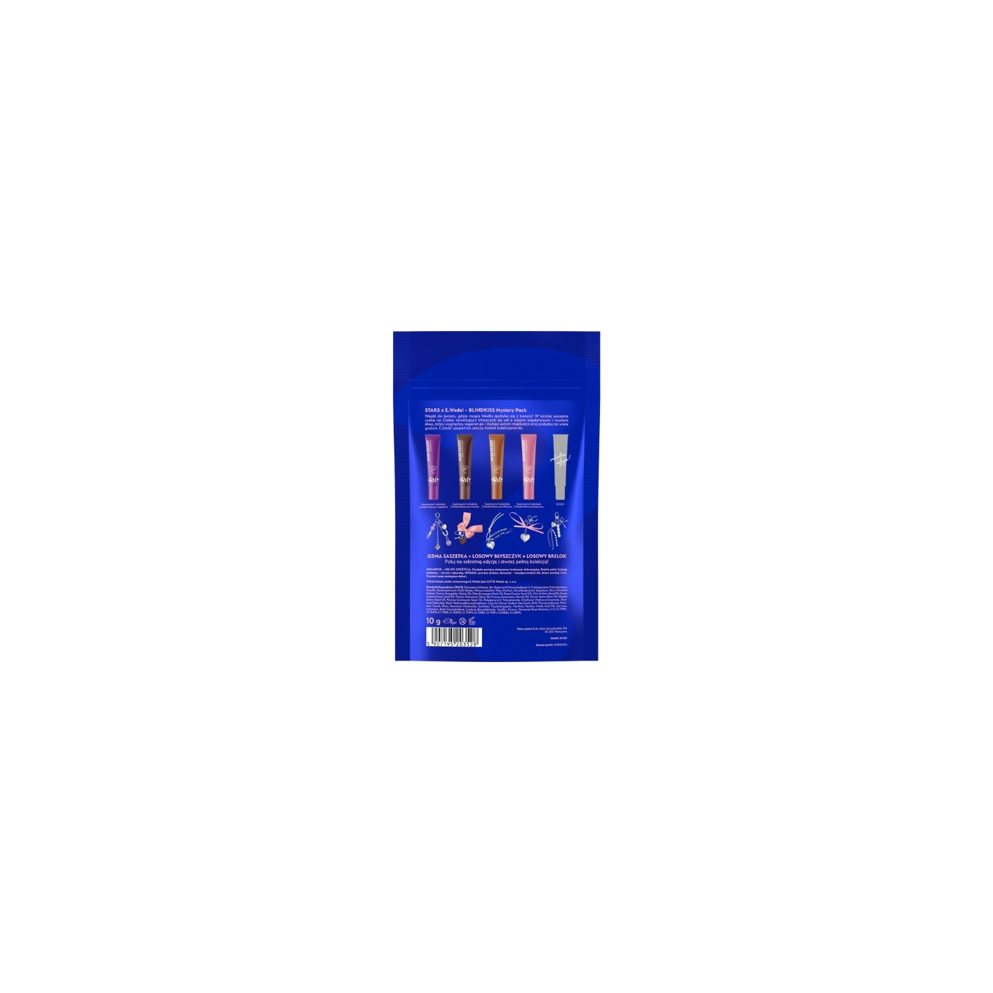 Le coffret mystère The Stars x E.Wedel – Blindkiss est une combinaison unique de produit cosmétique et d'objet de collection. Il si un gloss Kiss Gloss aléatoire et un porte-clés inspiré des saveurs emblématiques des chocolats E.Wedel. Ce gloss offre un soin intensif aux lèvres : il les hydrate, les lisse et les régénère, tout en leur apportant une brillance sublime. Sa formule laisse les lèvres douces, lisses et confortables pendant des heures. Le produit est disponible dans plusieurs parfums inspirés de saveurs emblématiques, notamment :
