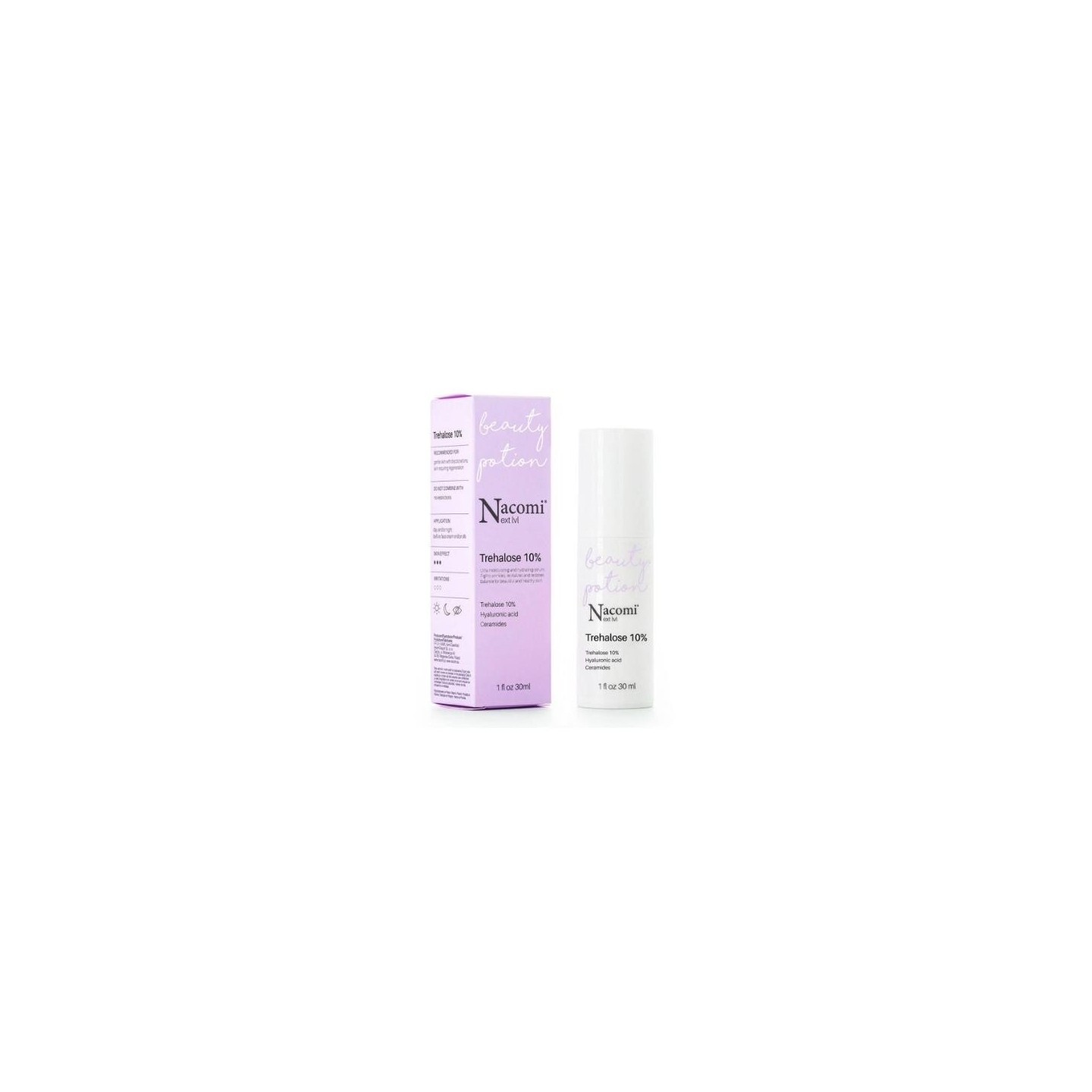 Nacomi Next Level Serum met 10% trehalose is een multifunctioneel product, speciaal ontwikkeld voor de droge, gevoelige en rijpe huid. De geavanceerde formule combineert krachtige hydratatie met anti-aging eigenschappen, waardoor de huidconditie al vanaf de eerste toepassing verbetert. Dankzij de trehalose bootst het serum de natuurlijke vochtregulerende factor ( NMF ) van de huid na, versterkt het de beschermende huidbarrière en voorkomt het vochtverlies. De huid si zachter, elastischer en zichtbaar gladder. Een complex van vier vormen van hyaluronzuur zorgt voor hydratatie op meerdere niveaus – van het huidoppervlak tot de diepere huidlagen. Daarnaast ondersteunen ceramiden en aminozuren de regeneratie en versterken ze de hydrolipidenbarrière, waardoor de huid beschermd wordt tegen invloeden van buitenaf. De formule heeft ook een kalmerende werking: het vermindert roodheid, verzacht irritatie en ondersteunt de natuurlijke vernieuwingsprocessen van de huid, waardoor deze gezond en stralend wordt.