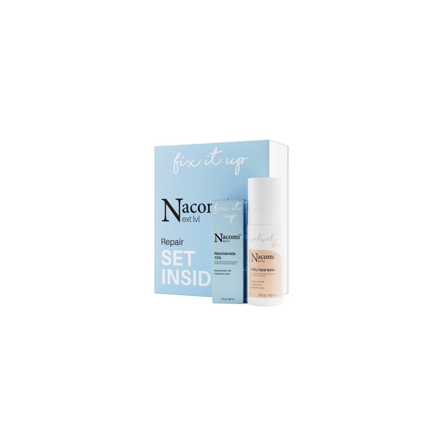 Nacomi Next Level Repair Gift Set Hydraterende melktonic 100 ml + Niacinamin Serum 15% 30 ml