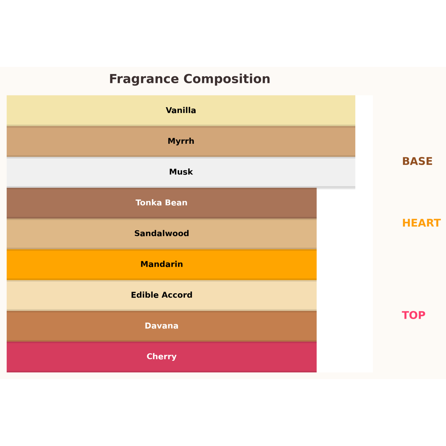 Sweet Heaven Cherry – een zoete en fruitige geur met een oosters accent: kers en mandarijn met davana in de opening, een fluweelzacht hart van mirre en sandelhout en een basis van muskus, vanille en tonkaboon