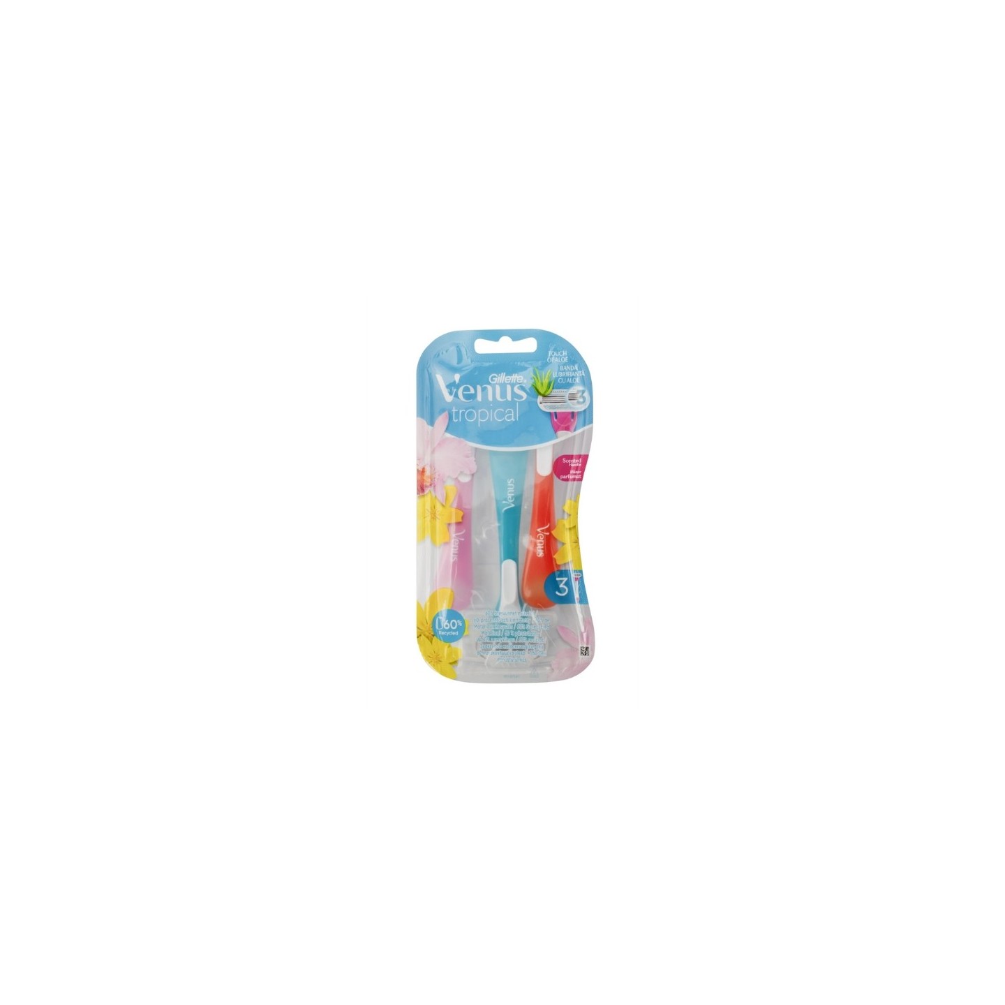 Gillette Venus TROPICAL wegwerpscheermesjes bieden een soepele en comfortabele scheerbeurt dankzij drie precisiemesjes omgeven door zachte beschermende kussens. Hun ronde, beweegbare kop maakt het gemakkelijker om moeilijk bereikbare plaatsen te scheren, en de slijtage-indicatorstrip verliest geleidelijk aan kleur, wat aangeeft dat het scheermes vervangen moet worden. Een speciaal ontworpen handvat zorgt voor meer controle tijdens het scheren en het scheermes kan na gebruik eenvoudig worden weggegooid, zonder dat de mesjes hoeven te worden vervangen.