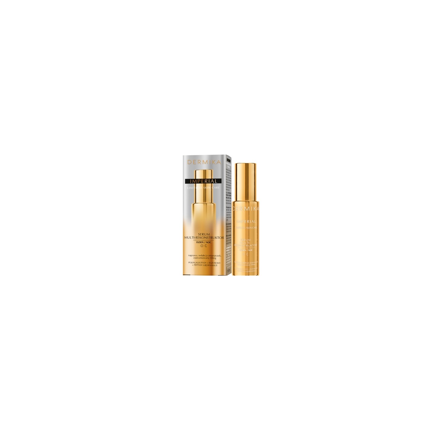 IMPERIAL Dermika Multi-Reconstructor Serum is een geconcentreerde behandeling voor gezicht, hals en decolleté, speciaal ontwikkeld voor een huid die intensieve regeneratie, versteviging en verbetering van de huidkwaliteit nodig heeft. De moderne formule, gebaseerd op biotechnologie, werkt op meerdere niveaus en ondersteunt de natuurlijke regeneratieprocessen zowel overdag als 's nachts. De lichte, snel si textuur maakt het serum een uitstekende basis voor make-up en een intensieve nachtbehandeling. De huid wordt steviger, dichter en zichtbaar gladder, waardoor ze er gezond, uitgerust en fris uitziet.