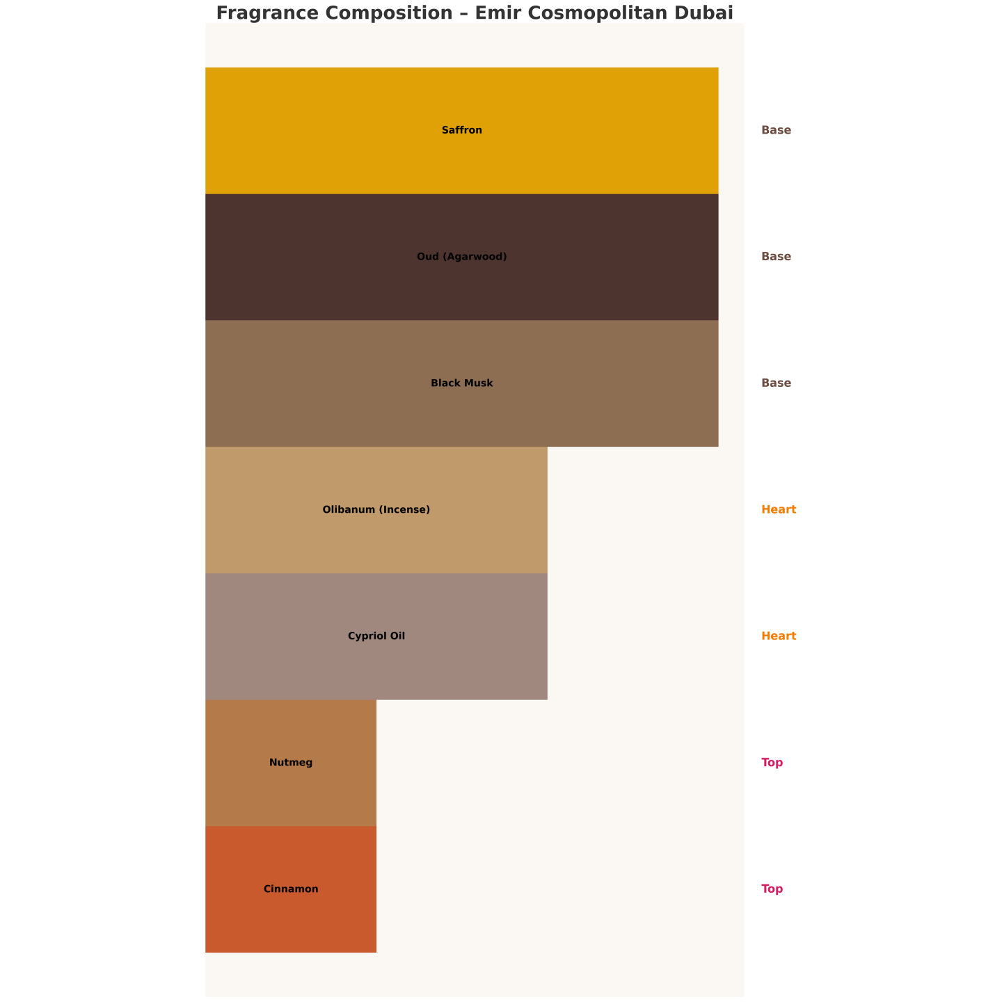 Насичений східний: гострі спеції у вступі, димний ладан та ципріол у серці, а в базі потужний уд, чорний мускус та розкішний шафран.