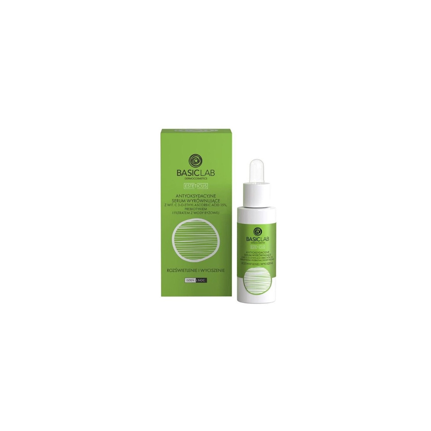 Антиоксидантна балансуюча serum BasicLab Esteticus зі стабілізованою формою етилвітаміну С у концентрації 15%, пребіотиком і фільтратом рисової води була розроблена для ефективного освітлення шкіри та заспокоєння подразнень і запалень. Ідеально зволожує, покращує натяг шкіри та відновлює її сяйво, надаючи їй здоровий вигляд.