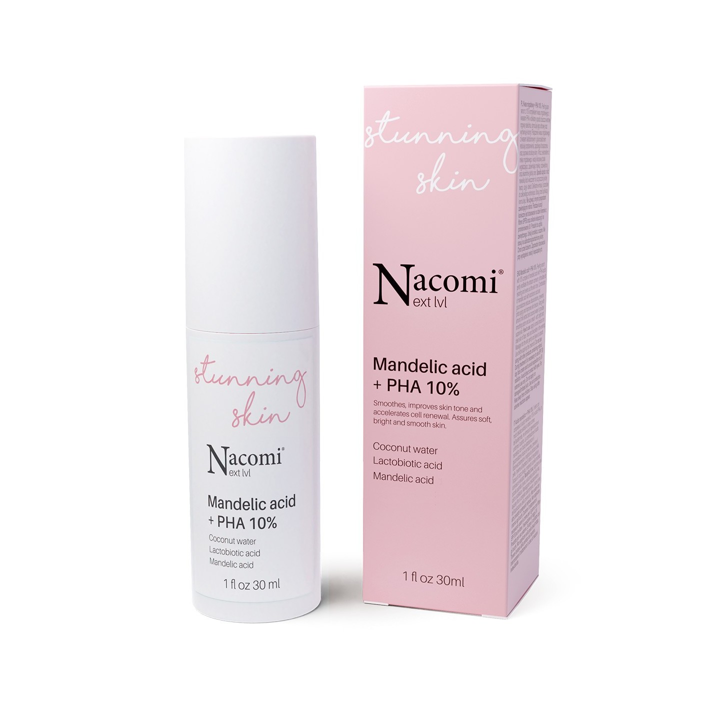 serum -пілінг з 10% комплексом мигдальної кислоти з PHA кислотами ніжно відлущує роговий шар епідермісу і стимулює його регенерує і вирівнює колір. Поєднання мигдальної кислоти і кислоти лактобіонова кислота та глюконолактон зменшує та запобігає знебарвленню фотостаріння і покращує структуру шкіри. З екстрактом молока мигдальна та кокосова вода має розгладжувальний ефект, надаючи м’якість, освітлений і оксамитовий гладкий колір обличчя.