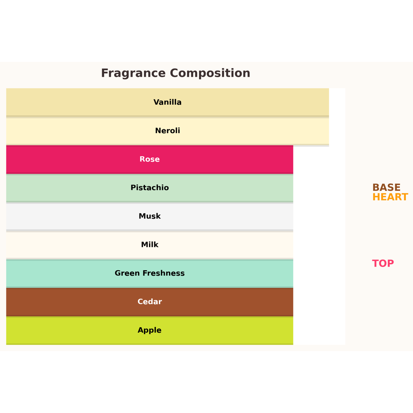 Аромат поєднує енергійну свіжість із затишною, молочною ванільною м'якістю. Він відкривається освіжаючим акордом фісташок, яблука та зеленого листя. Неролі та квітка троянди в серці, підкріплені благородним кедром, надають композиції елегантного квіткового відтінку. База - це кремова суміш ванілі, молока та мускусу, що залишає чуттєвий, тривалий шлейф. Ідеальний вибір для весни та осені, коли ви хочете si свіжим, комфортним та ніжно спокусливим.