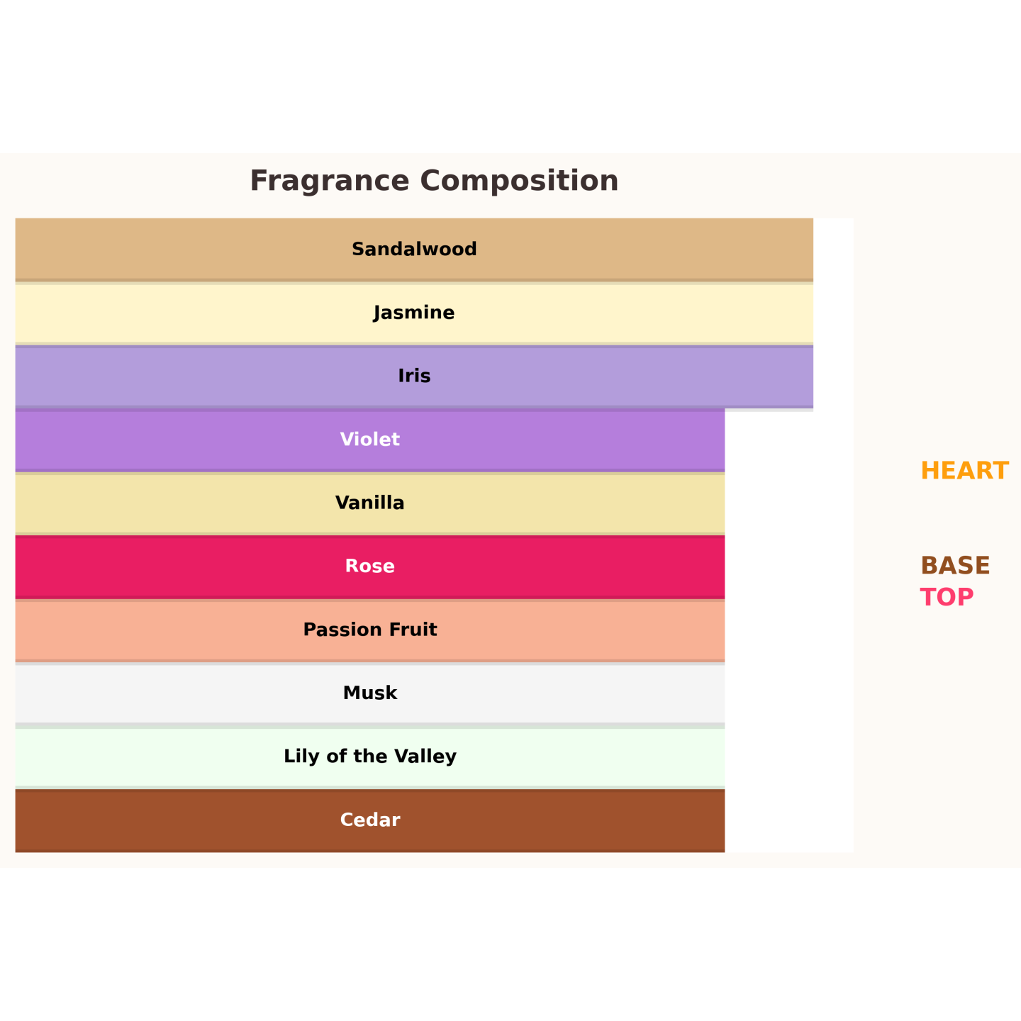 Fayora з перших секунд полонить елегантністю та впевненістю. Соковита маракуйя si з романтичною трояндою, надаючи композиції яскравого, чуттєвого початку. У серці розкривається м'який, пудровий букет – ірис, жасмин, конвалія та фіалка танцюють у гармонії, створюючи оксамитову ауру. Фініш огортає шкіру кремовою сумішшю сандалового дерева та кедра, пом'якшених ваніллю та ніжним мускусом. Це сучасне, витончене вираження жіночності – заспокійливе, але водночас природно розкішне.