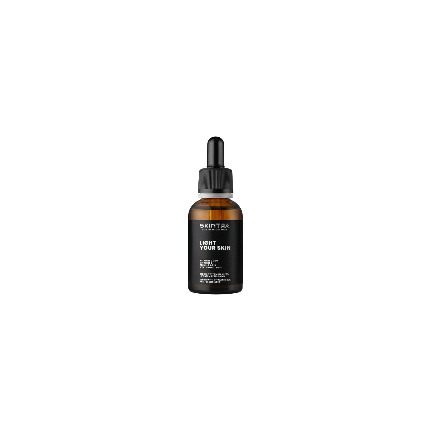 SkinTra - Light Your Skin - це передова освітлююча та освітлююча сироватка з потужним антиоксидантним комплексом. Основним інгредієнтом є 20% вітаміну С у формі L-аскорбінової кислоти, яка сприяє підвищенню тонусу шкіри, зменшує тьмяність, бореться з вільними радикалами, уповільнює процес старіння та має протизапальні властивості. Сироватка додатково збагачена вітаміном Е, відомим як «вітамін молодості», і феруловою кислотою, яка діє синергічно з вітаміном С, стабілізуючи його дію.