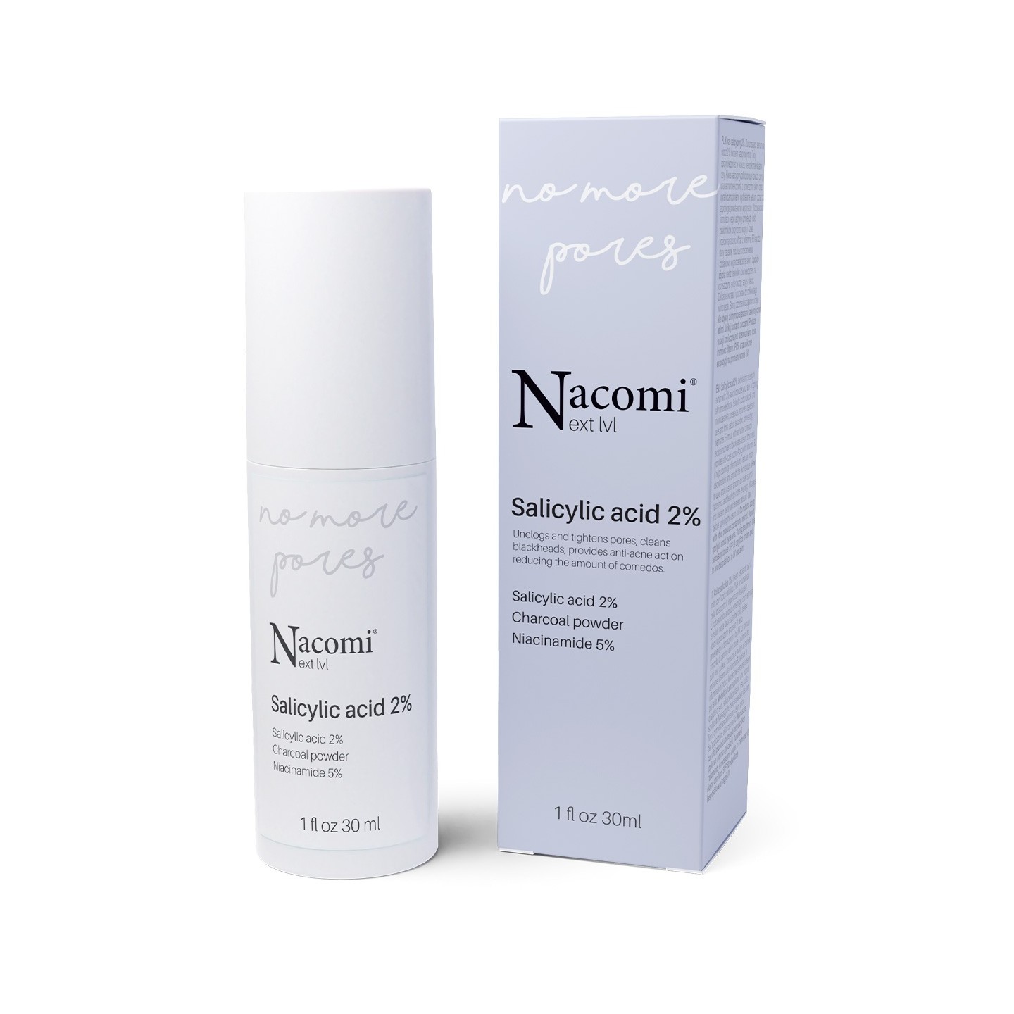 Саліцилова кислота видаляє мертві клітини з поверхні шкіри та обмежує надмірне виділення шкірного сала, таким чином запобігаючи утворенню прищів. Прекрасно розчиняється в жирах, тому проникає в сальний шар шкіри, досягаючи закупорених пор. У результаті розблоковуються сальні залози, роблячи пори менш помітними, а шкіру гладкою та чистою. Саліцилова кислота регулює процес загоєння подразнень, зменшує зміну кольору та плями від прищів. Ефективно позбавляє dzik і покращує текстуру шкіри.Aqua , ніацинамід, гліцерин, саліцилова кислота, вугільний порошок, Амілопектин, полідекстроза, декстрин, лимонна кислота, ксантанова камедь, целюлоза, Гекторит, дегідрооцтова кислота, бензиловий спирт.