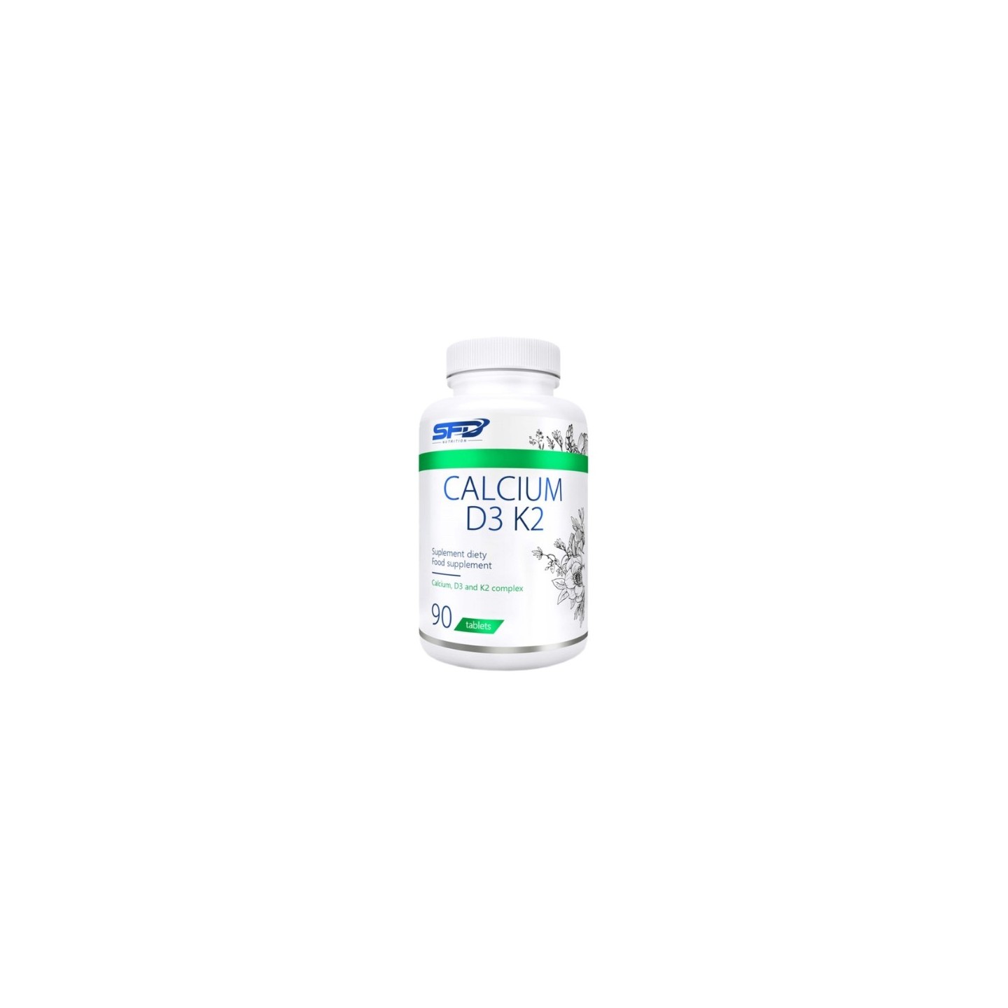 SFD Calcium D3 K2 - комплексна дієтична добавка, призначена для фізично активних людей і всіх тих, хто хоче подбати про здоров'я кісток, зубів, м'язів та імунітету. Формула на основі високоякісного кальцію, вітаміну D3 і вітаміну K2 MK-7 (отриманого з натто) забезпечує оптимальну підтримку скелетної, нервової та імунної систем. Кальцій відіграє ключову роль у підтримці належної мінералізації кісток, підтримує згортання крові, нервову провідність і функцію м'язів. Вітамін D3 покращує засвоєння кальцію, допомагає підтримувати здоров'я кісток і зубів, благотворно впливає на si м'язів і роботу імунної системи. Вітамін K2 MK-7 у своїй найбільш засвоюваній формі підтримує транспортування кальцію до кісток, запобігаючи його накопиченню в кровоносних судинах, а також сприяє правильному згортанню крові.