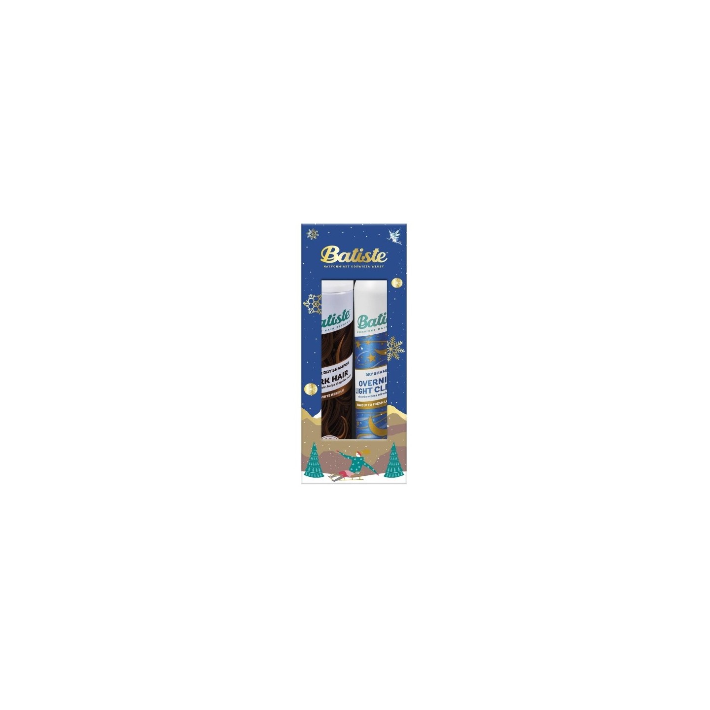 Відкрийте для себе магію свята з унікальним набором Batiste, який поєднує в собі два чудові сухі шампуні: Dark Hair і Overnight Light Cleanse - ідеальне рішення для людей, які хочуть зберегти своє волосся свіжим і об'ємним навіть під час найнапруженіших святкових моментів.
