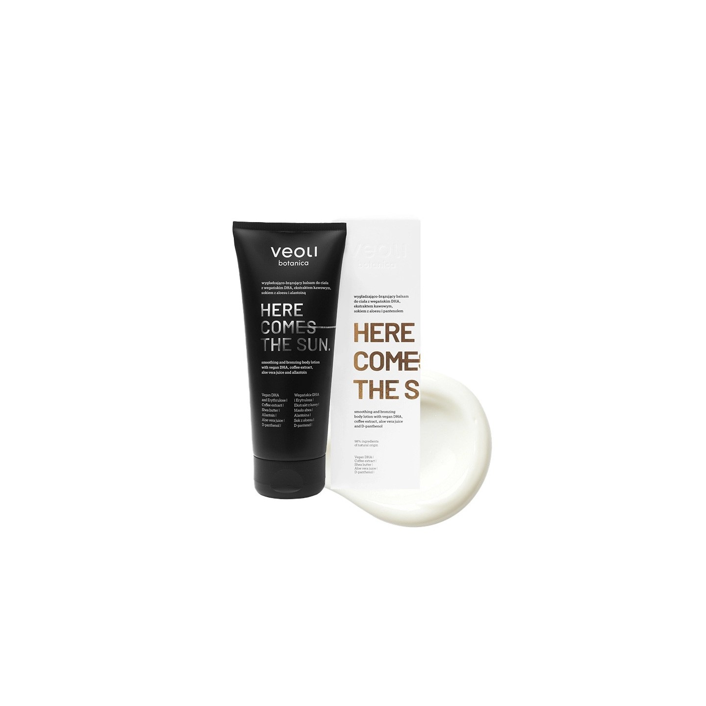 Відчуйте сонце на своїй шкірі – незалежно від пори року! Лосьйон для засмаги HERE COMES THE SUN забезпечує природний карамельний загар без смуг, плям та ризику фотопошкодження. Формула на основі веганського DHA, екстракту кави, соку алое та пантенолу не тільки надає гарного кольору, ale інтенсивно зволожує, регенерує та розгладжує шкіру.