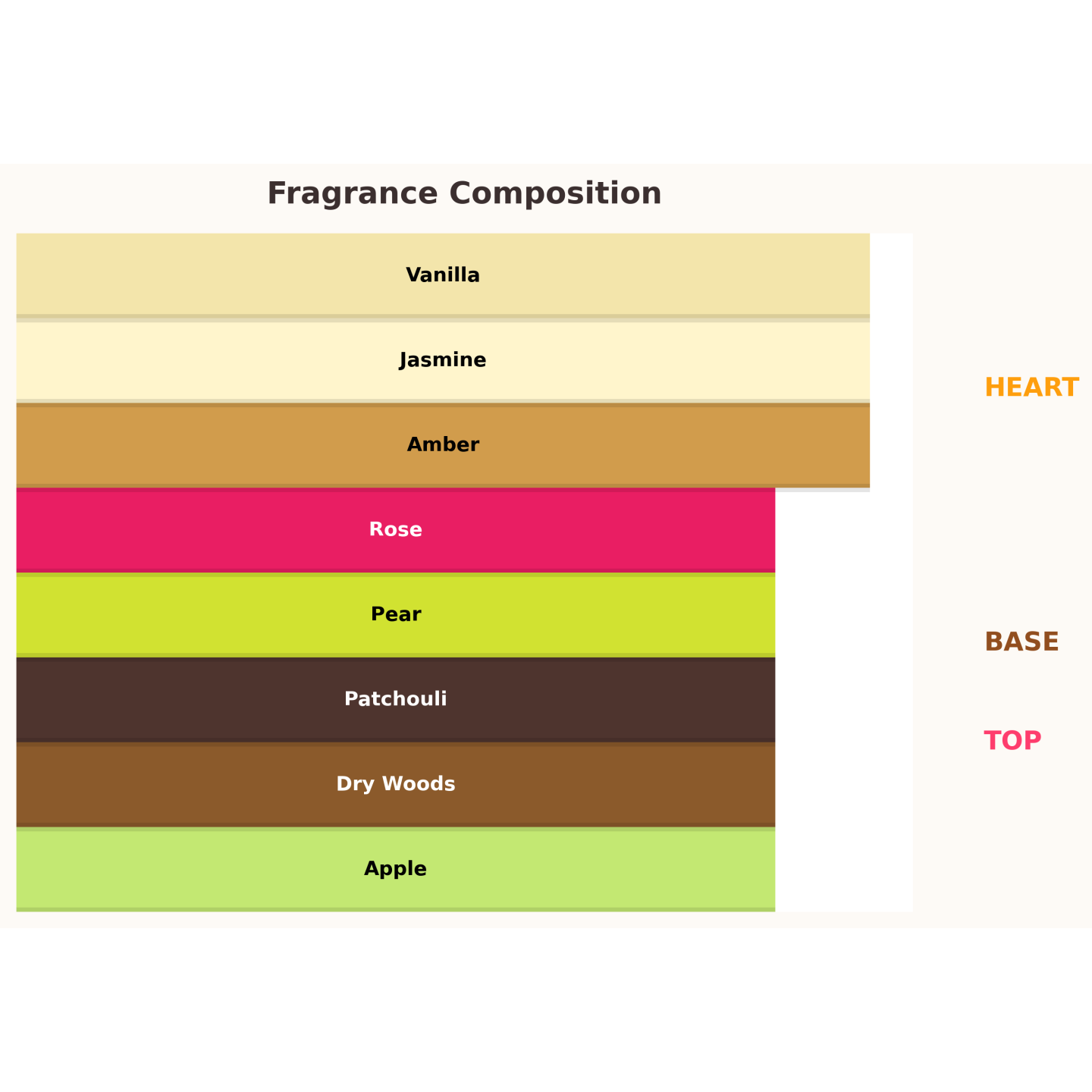Енергійна композиція, що відкривається свіжим дуетом яблука та груші, а потім огортає вас сяючим серцем жасмину та троянди з ніжною ваніллю. База з амбри та дерева з пачулі додає елегантності та створює приємну ауру близько до шкіри. Легко носити щодня, особливо навесні та влітку.