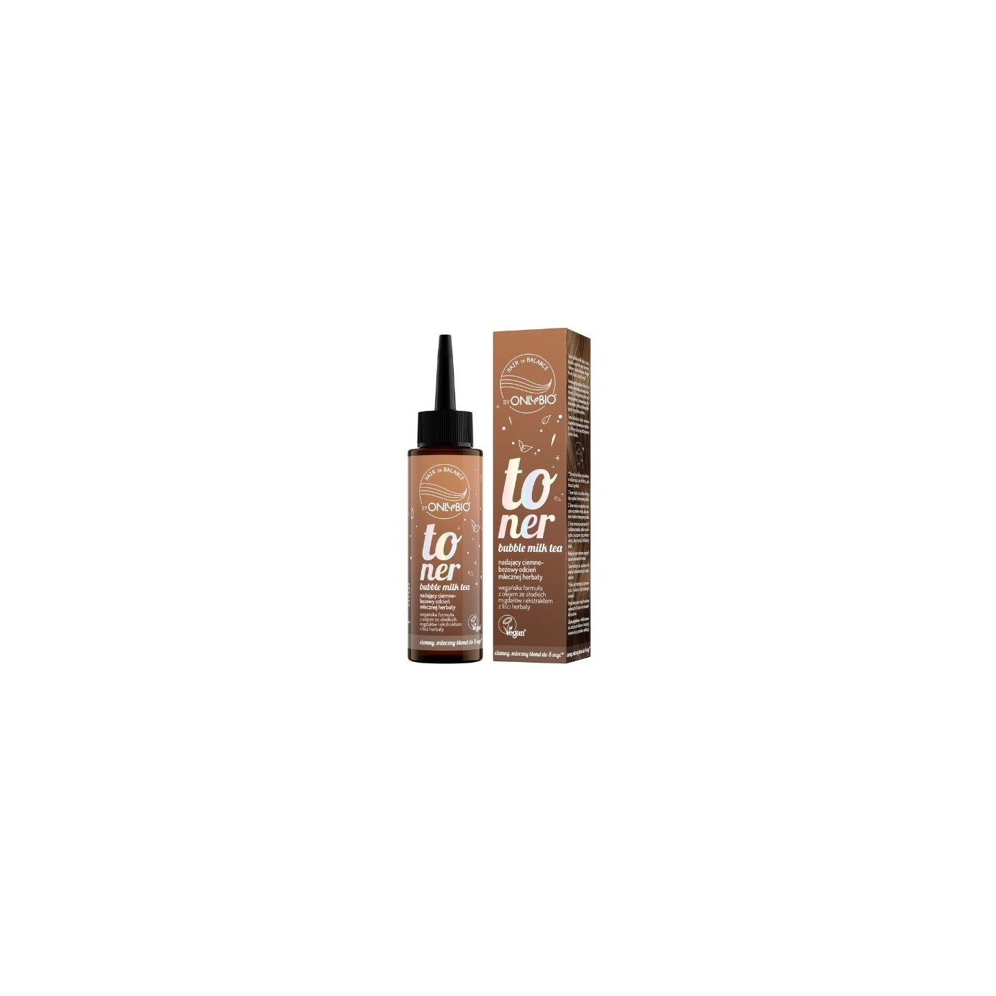 OnlyBio Hair in Balance Bubble Milk Tea Hair Toner — ідеальне рішення для людей, які хочуть надати своєму волоссю ніжних, теплих відблисків, натхненних кольором популярного напою Bubble Milk Tea. Його унікальна формула, що не містить аміаку та перекису водню, дозволяє делікатно, але ефективно освіжити колір волосся. Тонік діє м'яко, але при цьому ефективно проникає між лусочками волосся, надаючи пасмам красивий блиск і здоровий вигляд. Формула тонера збагачена поживними речовинами, такими як олія цубакі та масло какао, які інтенсивно живлять волосся, розгладжують його та сприяють регенерації. Це робить волосся шовковистим, м'яким на дотик і наповненим природним блиском. Засіб підходить як для натурального, так і для фарбованого волосся, ефект фарбування si до восьми мийок, залежно від структури та пористості волосся. Під час нанесення тонік огортає волосся ніжним молочно-чайним ароматом, що перетворює процес фарбування на приємний ритуал догляду. Ви можете використовувати його по-різному, регулюючи інтенсивність ефекту відповідно до ваших потреб – на сухому волоссі для більш насиченого кольору або на вологому волоссі для більш тонкого результату. Для отримання ніжного відтінку тонік також можна поєднувати з улюбленою маскою для волосся. Продукт простий у використанні та гарантує рівномірне нанесення без небажаних смуг. Однак під час нанесення рекомендується надягати захисні рукавички, щоб уникнути фарбування шкіри. Завдяки інноваційному поєднанню догляду та фарбування тонік Bubble Milk Tea забезпечує освіжаючий ефект, піклуючись про стан вашого волосся.